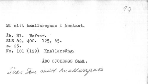 //// fy //// Si mitt kaallarepass i kontant. //// ib. NI. Wefvar. SLS 82, 400. 125, 65. //// s. 25. //// No. 101 (129) Knallarsång. //// ÅBO SJÖBERGS SAML. ////