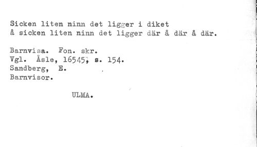 //// Sicken liten ninn det ligger i diket å sicken liten ninn det ligger där å där å där. //// Barnvisa. Fon. skr. j //// Vgl. isle, 16545* s. 154* //// Sandberg, E. Barnvisor. //// ULMA. ////