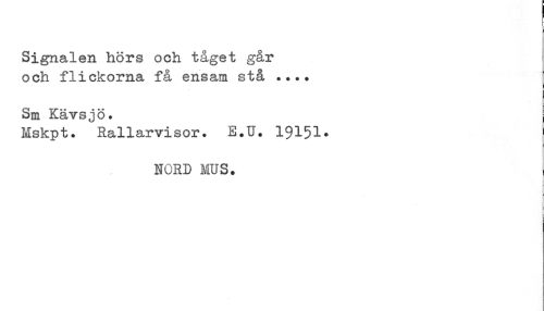 //// Signalen hörs och tåget går och flickorna få ensam stå ...» //// C*l T/* ? • * //// Sm Kavsjo. //// Mskpt. Rallarvisor. I.U. 19151* //// NORD MUS» ////