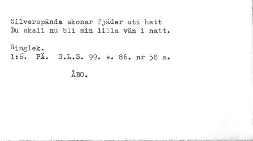 //// Silverspända skonar fjäder uti hatt Du skall nu bli min lilla vän i natt. //// Ringlek. //// 1:6. PÄ. S.L.S. 99. s. 86. nr 58 a. 1 //// ÅBO. //// ¦I //// •v': -i //// i //// ^^ - "" ' " ---*---— ---fc—---tt__.___... ___ . . ////