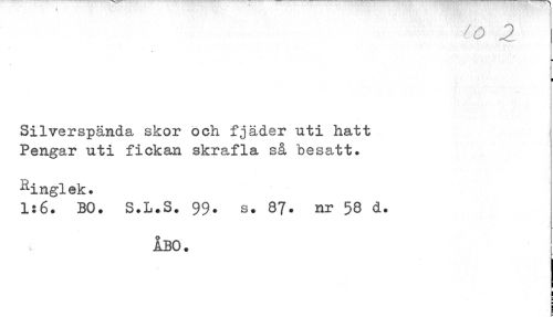 //// to 2 //// » //// ¦ //// v //// I //// Silverspända skor och fjäder uti hatt Pengar uti fickan skrafla så "besatt. //// -^inglek. //// 1:6. BO. S.L.S. 99. s. 87. nr 58 d. //// Ibo. ////
