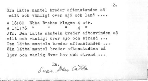 //// . 2- i Sin lätta mantel breder aftonstunden sa //// milt och vänligt över sjö och land ... A 16:80 Ebba Brahes klagan 4 str. //// A 141:76 " " » 4 " I //// Jfr. Ben lätta manteln breder aftonvinden så milt och vänligt över sjö och strand ... Den lätta manteln breder aftonstunden ... Sin lätta mantel breder aftonstudden så //// ljuv och vänlig över hav och strand ... i //// 1 ////