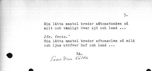 //// \ //// r / . » //// 3. //// i //// Sin lätta mantel breder aftonstunden så //// milt och vänligt över sjö och land ? //// ... ^ M # //// Jfr. fröts.' //// Sin lätta mantel breder aftonsolen så mild och ljus utöfver haf och land ... //// RA. ////