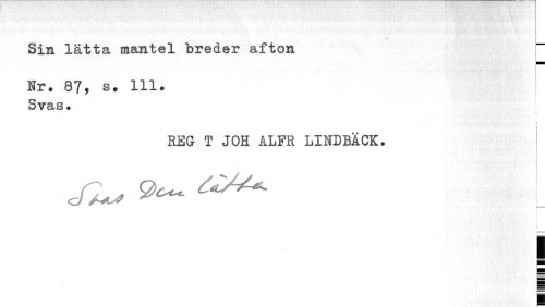 //// Sin lätta mantal breder afton //// Nr. 87, s. 111. //// Svas. //// i //// REG T JOH ALFR LINDBÄCK. //// i //// \ //// i //// i ////