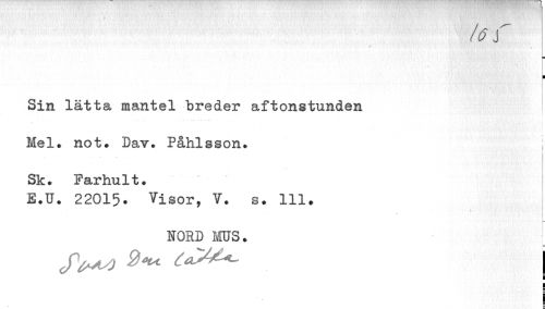 //// lö f //// '« 4 //// I //// Sin lätta mantel breder aftonstunden //// i //// ! //// i //// Mel. not. Dav. Påhlsson. j //// Sk. Farhult. //// E.U. 22015. Visor, V. s. 111. //// * //// NORD MUS. //// /W ^ ^^ j //// i //// I //// i ////
