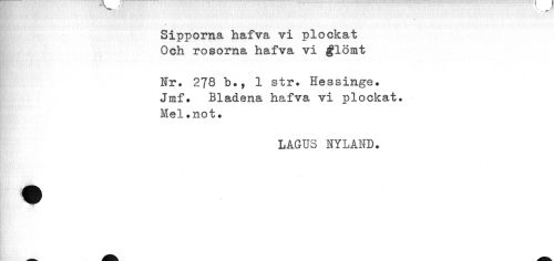 //// / //// Sipporna hafva vi plockat Och rosorna hafva vi $lömt //// Nr. 278 b., 1 str. Hessinge. Jmf. Bladena hafva vi plockat. Mel.not. //// LAGUS nyland. ////