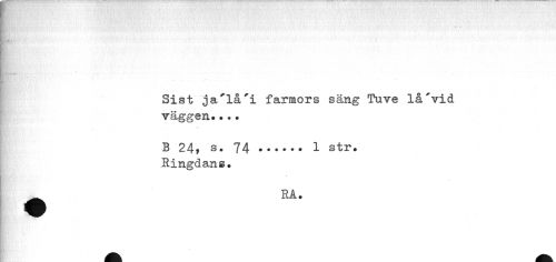 //// t, , //// Whr ... ... - . //// Sist ja'lå'i farmors säng Tuve lå'vid väggen... . //// m - //// B 24, s• 74 ... 1 str. //// Ringdans. //// • RA. //// Mfff-flF./- ////
