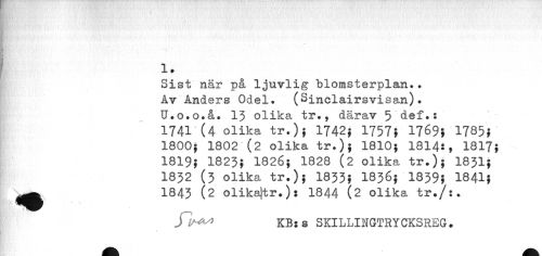 //// i //// . 1. //// ¦ //// 1 » //// Sist när på ljuvlig blomsterplan.. Av Anders Odel. (Sinclairsvisan). U.o.o.å. 15 olika tr., därav 5 def.s //// 1741-(4 Olika tr.)» 1742} 1757} 1769} 1785}" //// 1800} 1802"(2 olika tr.)} 1810} 1814:, 1817} 1819} 1825} 1826} 1828 (2 olika tr.)} I85I} //// 1852 (5 olika tr.)} 1855} 1856} 1859} 1841} //// 1845 (2 olika)tr.) s 1844 (2 olika tr./:. //// KB: s SKILLINGTRYCKSREG. ////