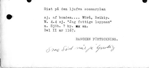 //// 4 //// Sist på den ljufva sommarplan //// sj. af bonden... Wörå, Reikip. W. 4.4 sj. "Jag fattige lappman" n. Sjöb. ? kp. ax sn. //// Del II nr 1167. //// RANCKEN FÖRTECKNING. //// 'V, ^ ^ « ^ ___^ ___ ^ ___ \ ^ ^ ^ ^ ^ ^ ___ ////