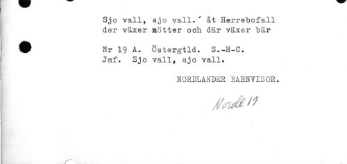 //// Sjo vall, sjo vall.' åt Herrebofall der växer nötter och där växer bär //// W Nr 19 A. Östergtld. S.-H-C. //// Jmf. Sjo vall, sjo vall. //// NORDLANDER BARNVISOR. //// fa/W //// i ////