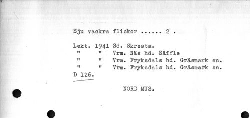 //// f • //// ^ V ... ... //// Sju vackra flickor ... 2 • //// Lekt. 1941 Sö. Skresta. » » Vrm. Näs hd. Säffle " w Vrm. Fryksdals hd. Gräsmark sn. //// 11 11 Vrm. Fryksdals hd. Gräsmark sn. //// D 126. //// # //// ^ NORD MS. //// « ////