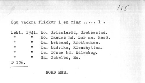 //// tff //// Sju vackra flickor i en ring ... 1 • //// Lekt. 1941. Bo. Grissleröd, Grebbestad. //// ,f M Bo. Tanums hd. Lur sn. Resö. //// w M Da. Leksand, Krokbacken. //// fl n Da. Ludvika, Klenshyttan. //// n 11 Ds. Tösse hd. Edleskog. //// M " Gä. Ockelbo, lo. //// D 126. //// NORD MUS. ////