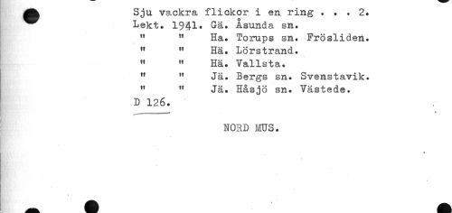 //// ^^ Sju vackra ilickor i en ring . . . 2. //// ^^ Lekt. 1941* Gä. Åsunda sn. //// " tt Ha. Torups sn. Fröslideri. 11 11 Hä. Lörstrand. //// M " Hä. Vallsta. n " Jä. Bergs sn. Svenstavik. //// 11 tf Jä. Håsjö sn. Västede. //// D 126. //// NORD MS. //// I //// % ////