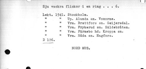 //// Sju vackra flickor i en ring . . . 6. //// / //// Lekt. 1941* Stockholm. //// H " TJp. Alunda sn. Voxorne. //// " tf Trrn. Brättfors sn. Geijersdal. //// " Yrra- ^rykerud sn. Säldebråten. //// M M Yrm. Färnebo hd. Kroppa sn. //// w " Vrm. Råda sn. Hagfors. //// D 126. //// a //// _ NORD MUS. //// V ////