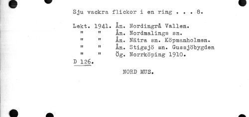 //// Sju vackra flickor i en ring . . . 8» //// Lekt. 1941» Ån. Nordingrå Vallen. //// in. Nordmalings sn. //// « in. Hatra sn. Köpmanholmen, //// in. Stigsjö sn. Gussjöbygden //// " " Ög. Norrköping 1910. D 126. //// NORD MUS. ////