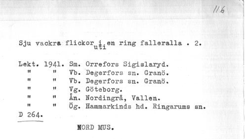 //// (U //// \ I //// I //// Sju vackre flickor^en ring falleralla . 2. //// Lekt* 1941* Sm. Orrefors Sigislaryd. * 11 Vb. Degerfors sn. Granö. //// w rl Vb. Degerfors sn. Granö. //// 11 r1 Vg. Göteborg. 11 w Ån. Nordingrå, Vallen. //// » ög. Hammarkinds hd. Ringarums sn. [ //// D 264. //// HORD MUS. //// 1 ////