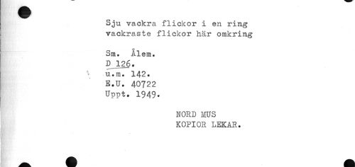 //// Sju vackra flickor i en ring vackraste flickor här omkring //// Sm. Ålem. D 126. t u.m. 142. E.U. 40722 //// uppt. 1949. //// NORD MS KOPIOR LEKAR. ////