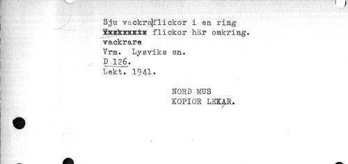 //// Sju vaekrajflickor i en ring SxBkxxxtx flickor här omkring, vackrare //// Trm. Lysviks sn. //// 1 D 12§* //// LektV 1941. //// » //// NORD MUS //// KOPIOR LEKAR. //// f //// 1 ////