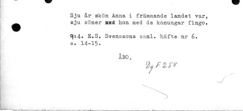 //// Sju år skön Anna i främmande landet var, ^^ sju söner mmt hon med de konungar fingo. //// C{:4* E#S. Svenssons saml. häfte nr 6. s. 14-15. //// ABO. //// fofzrr //// / //// j //// 'Si. //// S—__^___„___„___, ___ ////