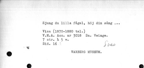 //// Sjung du lilla fågel, höj din sång ... //// Visa (1870-1880 tal.) //// V.M.A. Acc. nr 3018 Sn. Veinge. //// 7 str. a 5 v. //// Sid. 16 - \ } //// ^ VARBERG MUSEUM. //// • N « ////