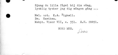 //// Sjung du lilla fågel höj din sång, lycklig tycker jäg dig mången gång . //// ^^ Mel. not. K.A. ^ignell. //// Dr. Enviken. //// Mskpt. Visor VII, s. 351. E.U. 28891. //// nord mus. //// -V V"''-- //// /—\ ////
