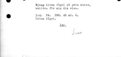 //// Bjung liten fågel på grön kvist, kvittra för mig din visa. //// £ 1:4. PÅ. INE. 46 nr. 6. //// Liten fågel. //// ÅBO. //// S //// i //// B • ////