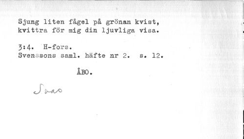 //// ; //// Sjung liten fågel på grönan kvist, //// kvittra för mig din ljuvliga visa. . //// i //// 3*4* H-fors. //// Sven o s O II s saml. häfte nr 2. s. 12. //// i //// ÅBO. //// B //// i ¦ //// i ////