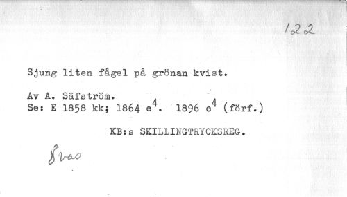 //// * //// i //// Sjung liten fågel på grönan kvist. //// v //// Av A. Säfström. . . //// Se: E 1858 kk} 1864 e4. I896 c4 (förf.) //// I //// KB:s SKILLINGTRYCKSREG. //// % ////
