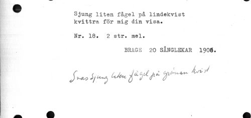 //// Sjung liten fågel på lindekvist kvittra för mig din visa. //// Nr. 18. 2 str. mel. //// BRAGE 20 SANGLEKAR 1908. //// S~o ii-} éw- ////