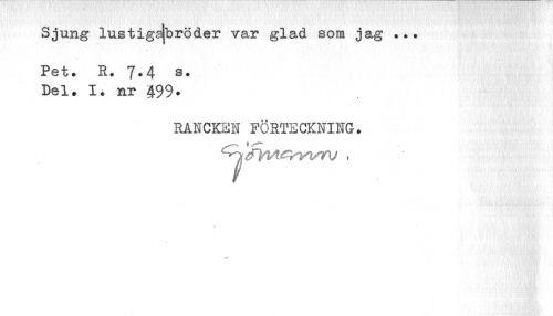 //// Sjung lustigajbröder var glad som jag //// Pet. R. 7.4 Del. I. nr 499* //// RANCKEN FÖRTECKNING. ////