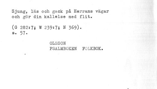 //// Sjung, läs och gäck på Herrans vägar och gör din kallelse med flit. //// (G 282:7i W 239*7? N 369). //// s. 57. //// OLSSON //// PSALMBOKEN FOLKBOK. ////