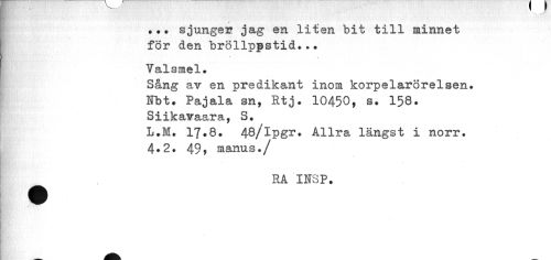 //// / //// •.. sjunger jag en liten bit till minnet för den bröllppstid... //// Valsmel. //// Sång av en predikant inom korpelarörelsen. Efbt# Pajala sn, Rtj. 10450, s. 158. Siikavaara, S. //// L.M. 17.8. 48/Ipgr. Allra längst i norr. 4*2. 49, manus./ //// RA IF3P. ////