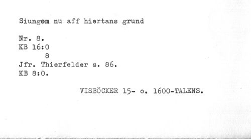 //// Siungom nu aff hiertans grund //// Nr. 8. KB 16:0 //// 8 //// Jfr. Thierfelder s. 86. KB 8:0. //// VISBÖCKER 15- o. 1600-TALENS. //// » ////