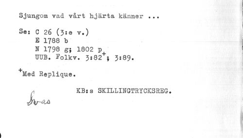 //// Sjungom vad vårt hjärta känner ... //// Ses C 26 (3:e v.) E 1788 b //// N 1798 g} 1802 p 1 //// UUB. Folkv. 3$82 } 3:89. //// + //// Med Replique. //// - //// KBss SKILLINGTRYCKSREG. //// Jv~^ //// I .IX //// II //// I ////