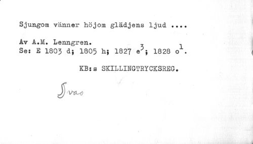 //// Sjungom vänner höjom glädjens ljud ... Av A.M. Lenngren. //// Ses E 1803 d; 1805 hj 1827 e5; 1828 o . //// KBss SKILLINGTRYCKSREG. //// j[viM ////