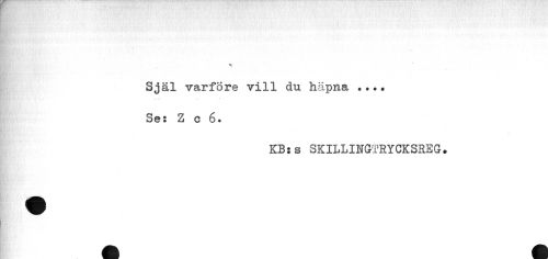 //// Själ vårföre vill du häpna Ses Z c 6. //// KB:s SKILLINGTRYCKSREG. //// * m ////