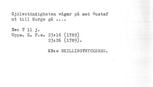 //// I //// Självständigheten vågar på med Gustaf ut till Norge gå ... //// Se: T 11 j. //// Upps. Z. P.s. 23:16 (1789) • //// 23:26 (1789). //// • m //// KB:s SKILLINGTRYCKSREG. ////