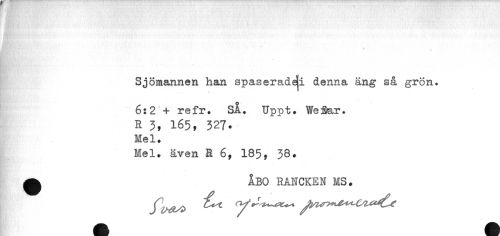 //// % //// Sjömannen han spaseradeji denna äng så grön. - 6:2 + refr. SÅ. Upp t. Wofiar. //// R 3, 165, 327. //// Mel. //// Mel. även E 6, 185, 38. //// A ÅBO RA3JCKEN MS. ////