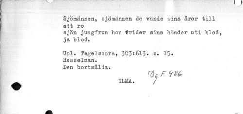 //// r //// Sjömännen, sjömännen de vände sina åror till att ro //// sjön jungfrun hon frider sina händer uti blod, ja blod. //// Upl. Tegelsmora, 303*613* s. 15» //// Hesselman. //// Den bortsålda. //// tyc F <f*é> //// • ULM. / //// ) ////