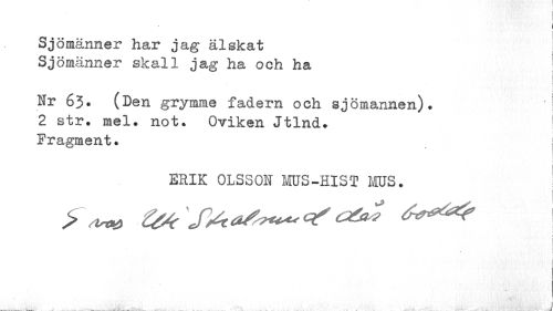 //// ! //// Sjömänner har jag älskat Sjömänner skall jag ha och ha //// Nr 63. (Den grymme fadern och sjömannen). 2 str. mel. not. Oviken Jtlnd. Fragment. //// : //// ERIK OLSSON MUS-HIST iÄUS. j //// I //// -.- 'AÉ^.^ä. iit/jåevé^St^initi^---. -i OUjf-b^i- ---L. . wili. . . -i. --- V . -i-. - <L ... ¦ ' .1 rf . '*•" ////