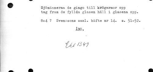 //// V w //// Sjömännerna de gingo till krögarmor opp tag fram de fyllda glasen häll i glasena opp. //// 8:4 ? Svenssons saml. häfte nr 14. s. 51-52. //// ÅBO. //// 0 ////