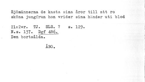 //// ¦ //// Sjöraännerna de kasta sina åror till att ro //// < //// sköna jungfrun hon vrider sina händer uti blod 21:2+r. TJ. SLS. ? s. 129. //// N.s. 137. 486. //// Den bortsålda. //// ! ! //// ÅBO. //// i //// ! //// i ////