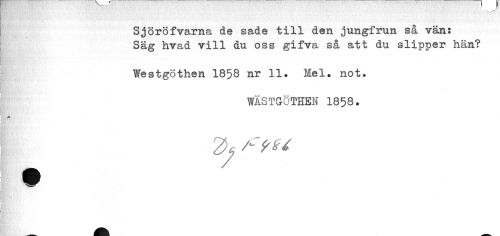 //// Sjöröfvarna de sade till den jungfrun så vän: Säg hvad vill du oss gifva så att du slipper hän? //// Westgöthen 1858 nr 11. Mel. not. //// WÄSTGÖTHEN 1858. //// A ////