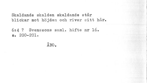 //// Skaldande skalden skaldande står blickar mot höjden och river sitt hår. //// 6:4 ? Svenssons saml. häfte nr 16. 8. 200-201. //// ÅBO. //// i i //// i ¦ ////