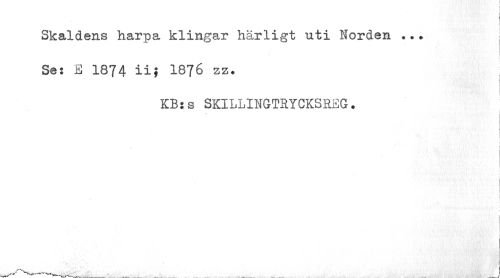 //// Skaldens harpa klingar härligt uti Norden •.? //// ] //// Ses E 1874 ii} 1876 zz. //// i i //// > I //// KB:s SKILLINGTRYCKSBEG. //// 1 //// i //// ---___. _ . ___ ___ I ////