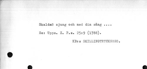 //// Skaldmö sjung och med din sång ... Ses Upps. Z. P.s. 25:9 (1788). //// kb:s skillingtrycksreg. //// 'i.-. ////
