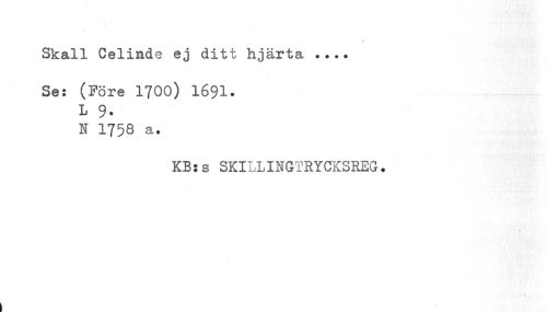 //// Skall Celinde ej ditt hjärta ... //// Se: (Före 1700) I69I. L 9. //// K 1758 a. //// KB:s SKILLINGTRYCKSREG. //// 1 ////