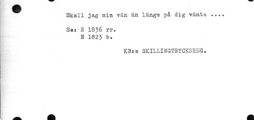 //// Skall jag min vän än länge på dig vänta ... //// Se: E 1836 rr. N 1823 b. //// KB:s SKILLINGTRYCKSREG. //// » ////