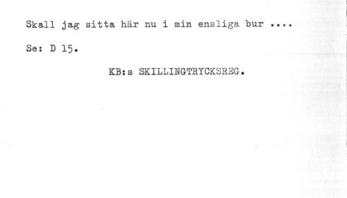 //// Skall jag sitta här nu i min ensliga bur //// Se: D 15. | //// KB:s SKILLINGTRYCKSREG. //// • 1 //// < //// i ! //// » ////