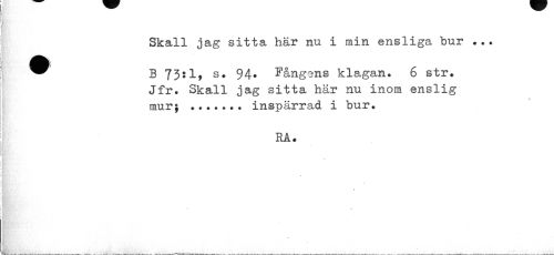 //// Skall jag sitta här nu i min ensliga bur ... //// i //// B 73:1, s. 94. Fångens klagan. 6 str. Jfr. Skall jag sitta här nu inom enslig mur; ... inspärrad i bur. //// RA. //// * //// 1 1 //// ___ _ ___^___ ___ _:___ssä_ __ ////